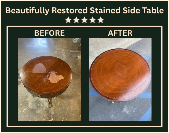 Our beautiful side table suffered when scented oil was spilled, and our DIY fix attempts only worsened the damage, leaving ugly stains. Green Bee Laser, recommended by a friend for a project, handled the restoration from start to finish, including staining and finish coats, with flawless results. Highly recommend their expert service!